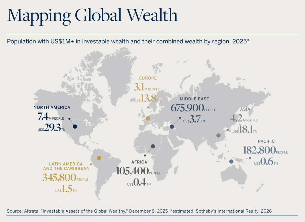Take North America, where 7.4 million people have at least US$1M ready to invest, totalling US$29.3TN, according to Altrata. Most of this—US$26.2TN—is held in the U.S. by 6.8 million individuals. North America is also home to 745 Sotheby’s International Realty affiliated offices and 22,508 affiliated sales associates.