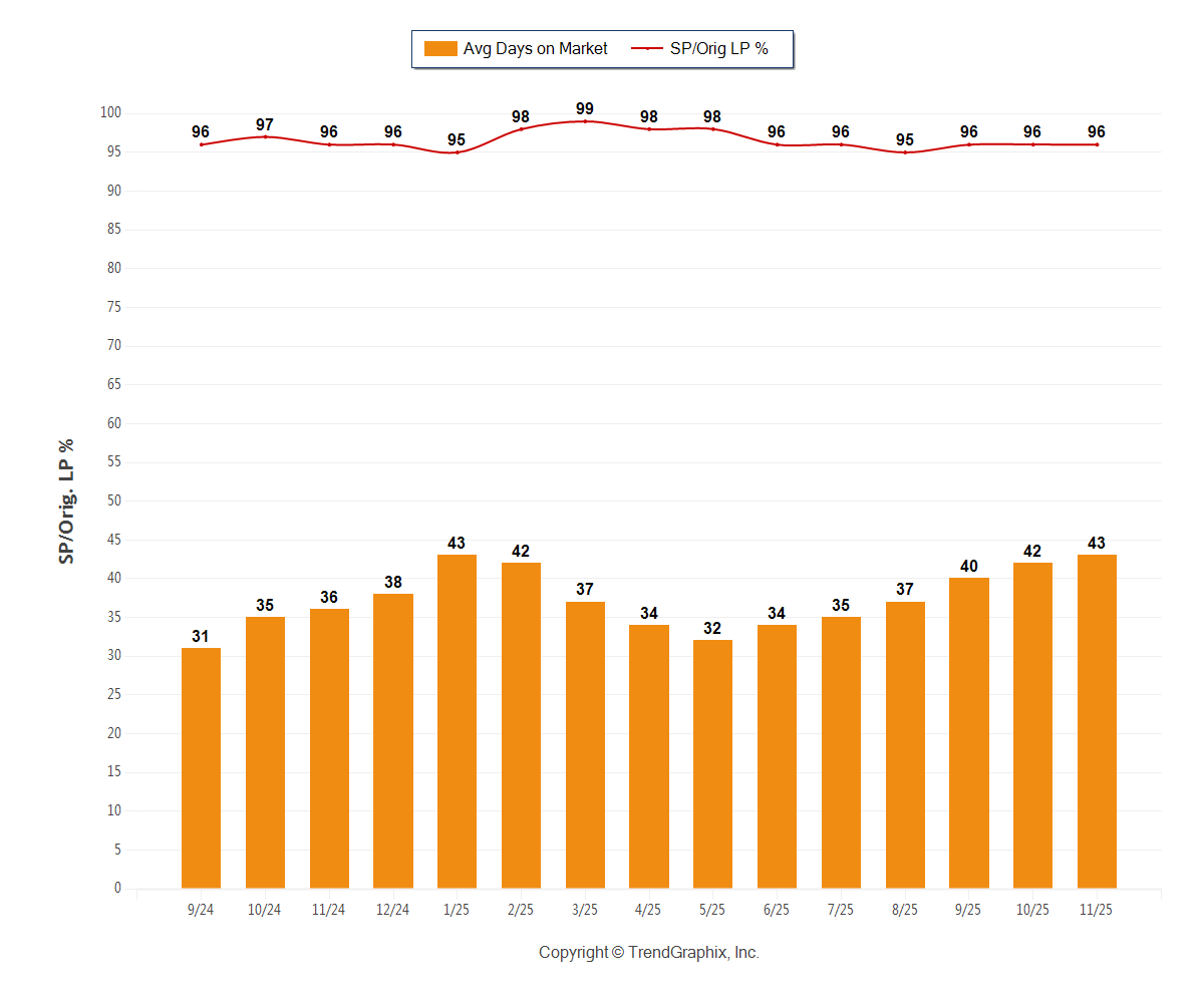 Looking at the annual trend, the change is more pronounced. Compared to this time last year, the average days on market has increased by 19.4%, showing that homes are spending noticeably longer on the market than they were in late 2024. Meanwhile, the sold-to-original list price ratio has held steady both month-over-month and year-over-year, registering no measurable change. This stability suggests that even though buyers are moving at a slower, more deliberate pace, sellers are still generally achieving their initial pricing expectations. Overall, the market reflects a more patient buyer pool, steady pricing discipline, and conditions that reward well-priced, well-prepared listings.